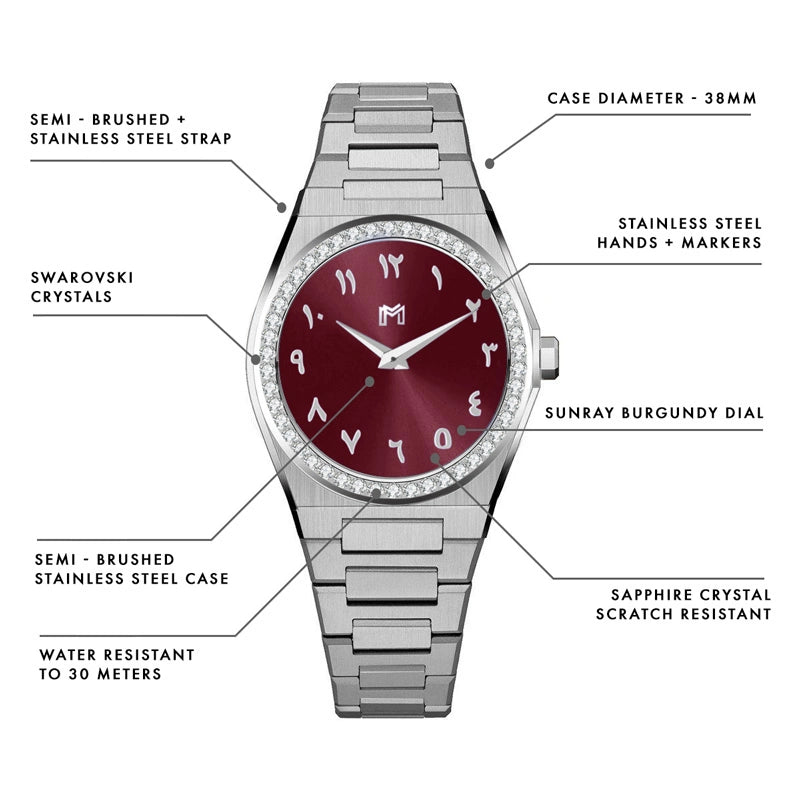 إليازية مصنوعة من جلد الجمل الأصلي مع تفاصيل معدنية باللون الذهبي ونمط M المميز.مميزة بخاصية الإغلاق المغناطيسي وسير قابل للفصل، اللذان يعكسان أسلوبًا عمليًا وأنيقًا في نفس الوقت