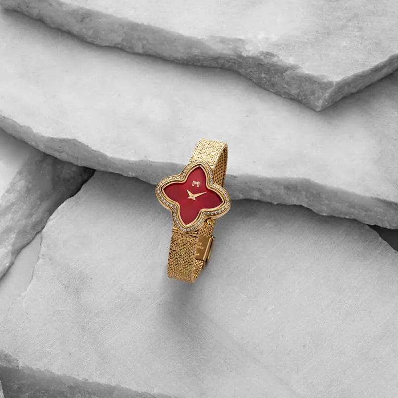 ميناء الساعة المستوحى من الأزهار يعكس تصميمًا خالدًا، بكريستالات براقة عالية الجودة، تعكس الضوء مع كل حركة وتحتفظ بسحرها اللامع. صُممت بدقة هندسية لتتناسب مع إنحناءات المعصم بسهولة، مما يمنحكم شعورًا بالراحة اللا متناهية طوال اليوم