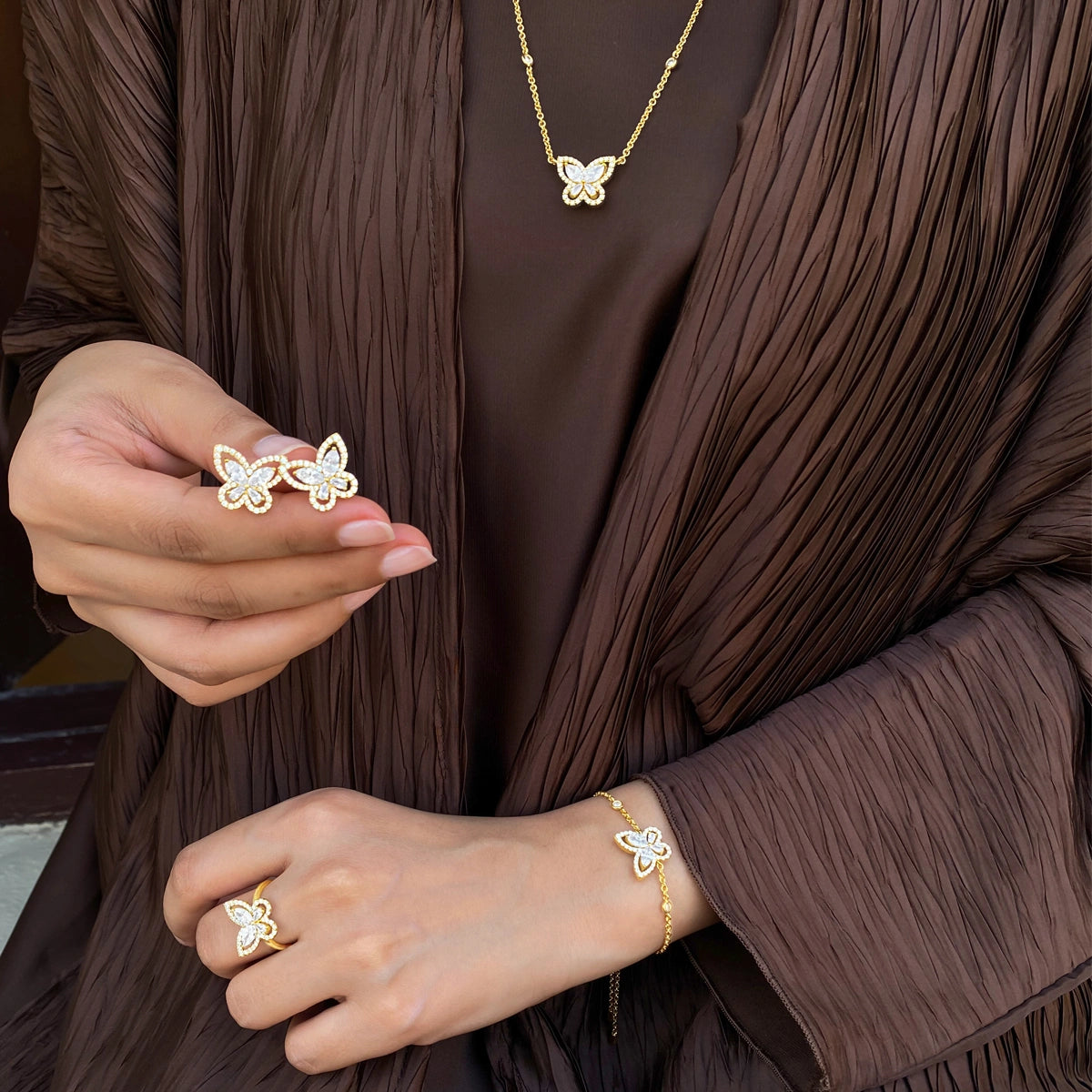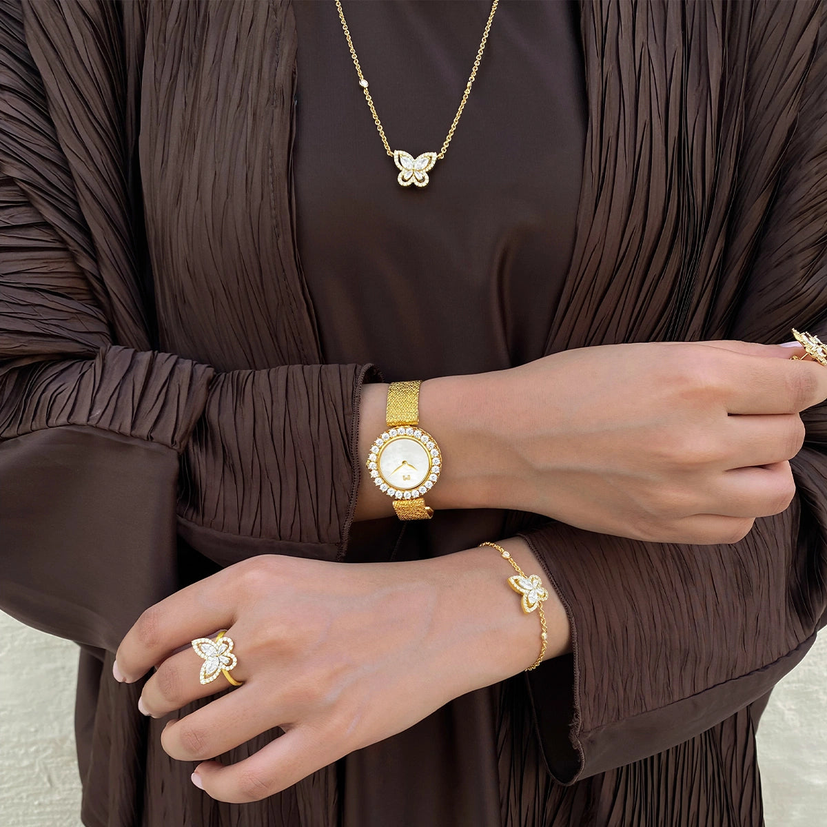 رقيقة ومشرقة، تعكس مجموعة الفراشة سحر الفراشة في أبهى صورة من الأناقة . صُمّمت للاستخدام اليومي والمناسبات، لتضيف بريقًا ناعمًا إلى كل إطلالة.