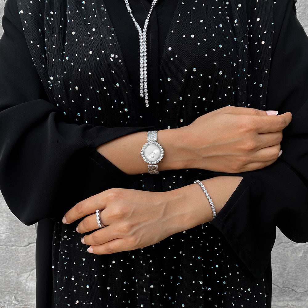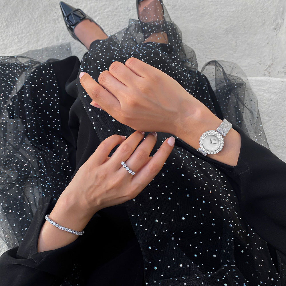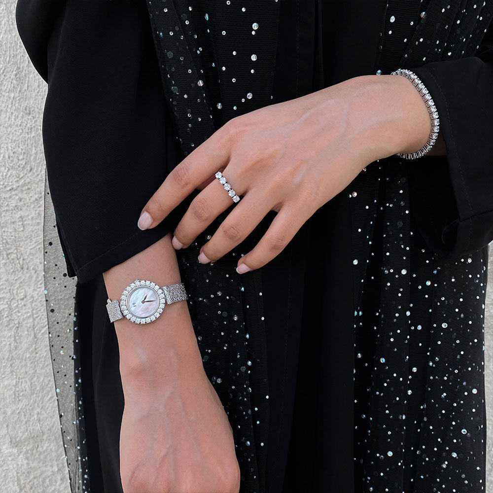 تتميز هذه الساعة الأنيقة بخفة الوزن، حيث تضفي شعورًا بالراحة اللا متناهية على المعصم ولمسة لامعة جذابة. مما يجعلها القطعة المثالية للمناسبات الخاصة.