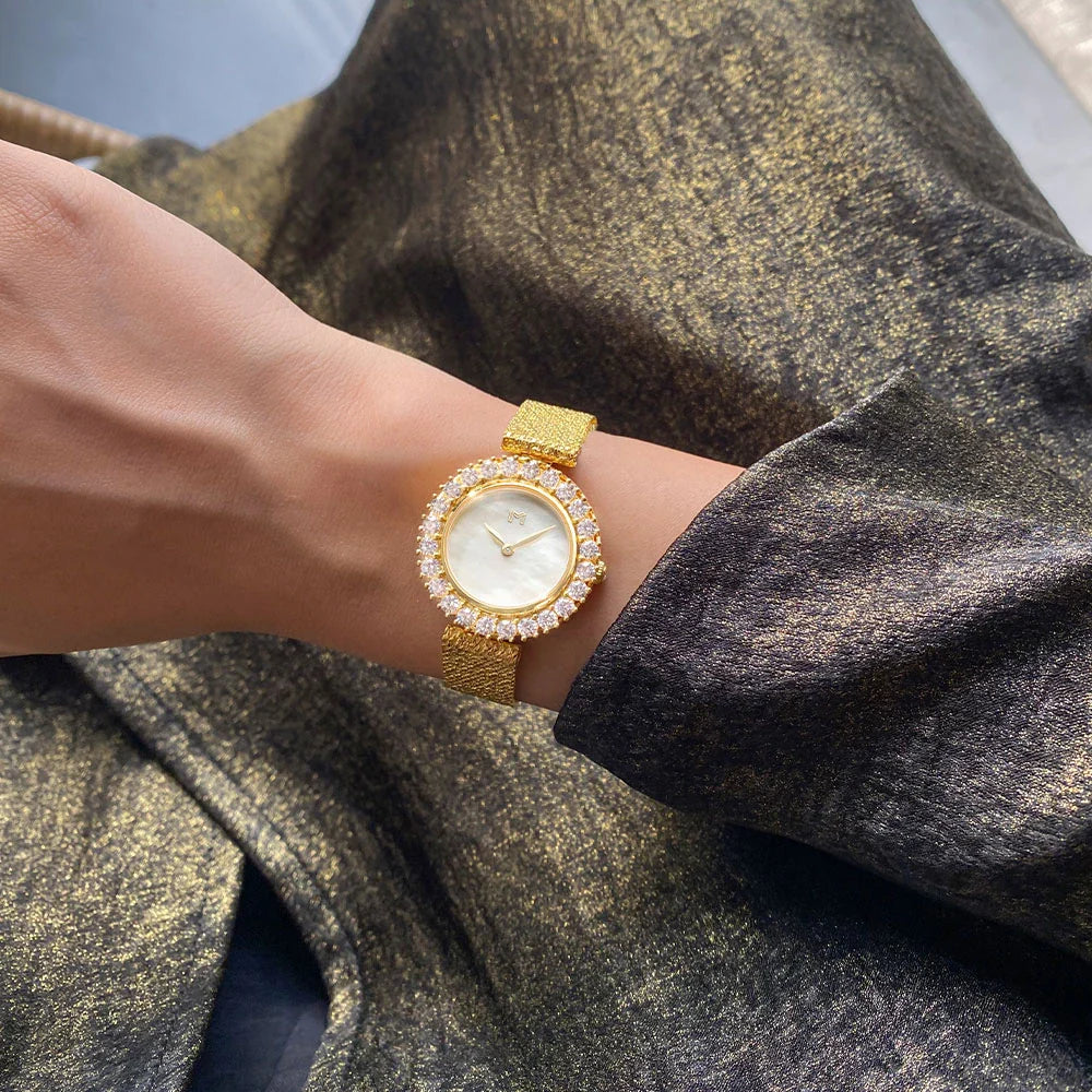 يتميز ميناء الساعة بكريستالات براقة عالية الجودة، تعكس الضوء مع كل حركة وتحتفظ بسحرها اللامع على مدار اليوم. صُممت بدقة هندسية لتناسب إنحناءات المعصم بانسيابية، مما يمنحكم شعورًا بالراحة اللا متناهية طوال اليوم