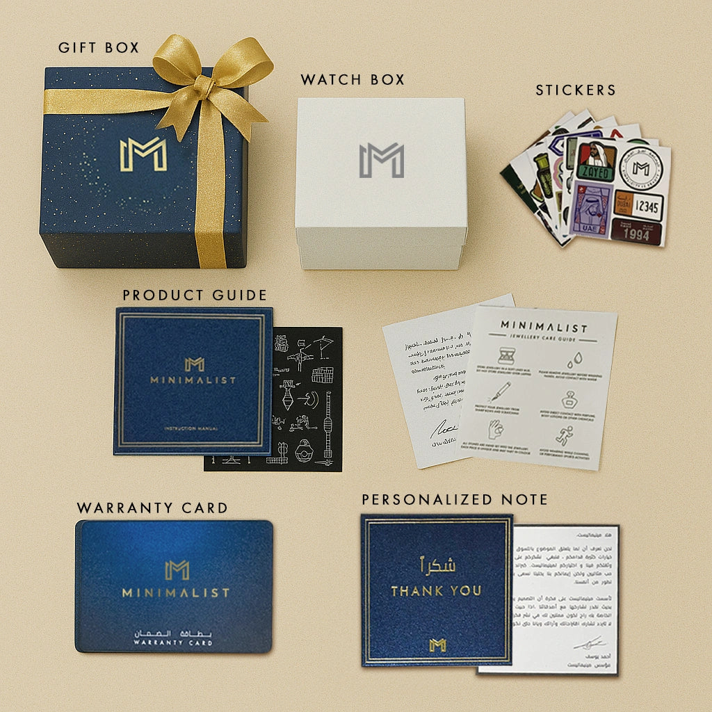 في مينيماليست، رضاكم هو أولويتنا القصوى. كل قطعة نصممها سواء أكانت شنطة من جلد الجمل الطبيعي، ساعة كلاسيكية خالدة أو مجوهرات مستوحاة من التراث الإماراتي فهي تُصنع بجودة لا تقبل المساومة وبأدق التفاصيل. نحن نضمن جودة منتجاتنا وفخامتها في كل مرحلة.