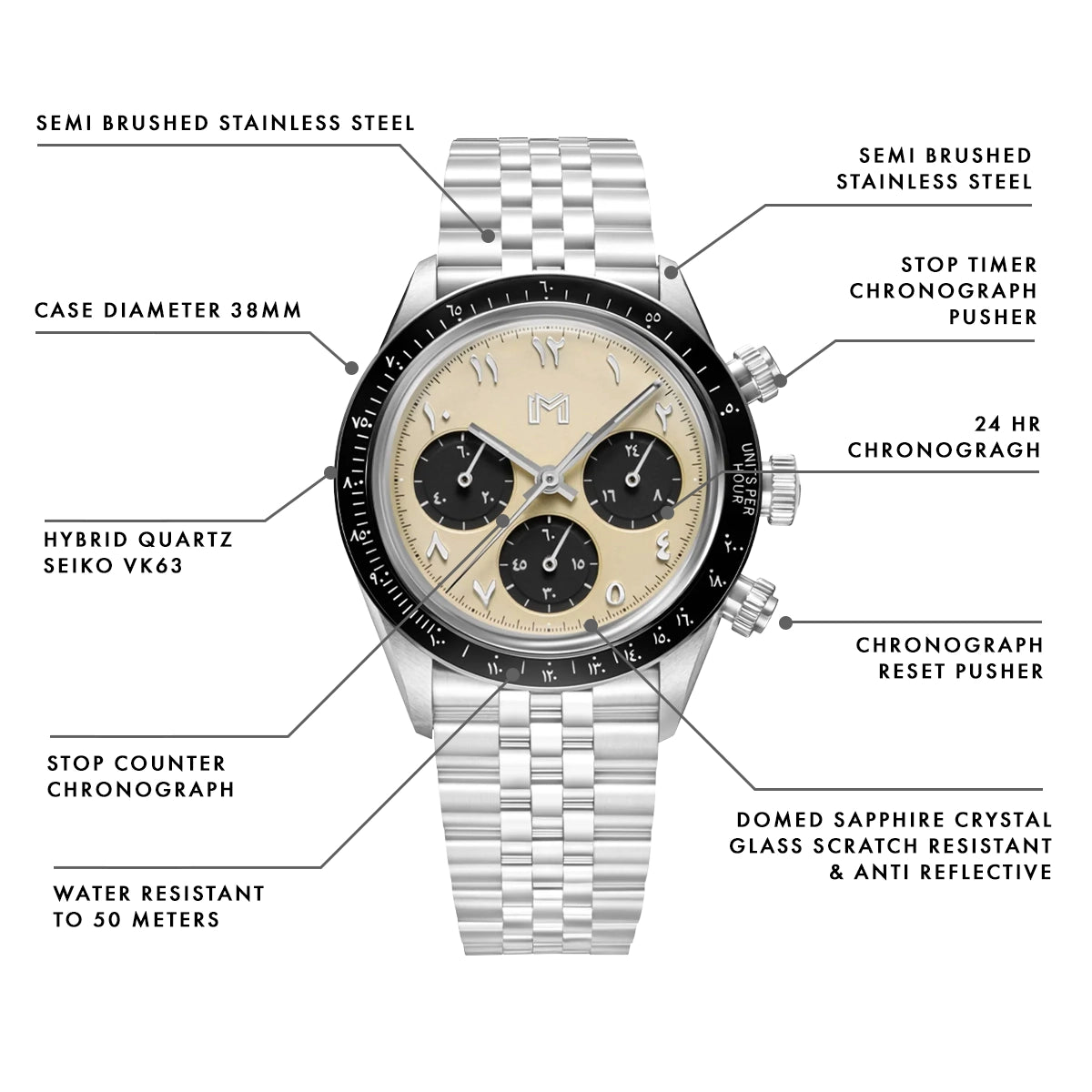 Our watches are crafted from premium stainless steel with sapphire crystal glass for scratch resistance and durability.