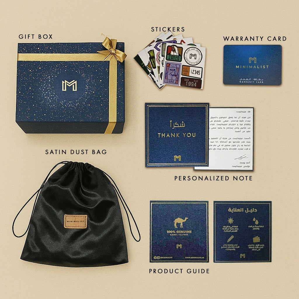 في مينيماليست، رضاكم هو أولويتنا القصوى. كل قطعة نصممها سواء أكانت شنطة من جلد الجمل الطبيعي، ساعة كلاسيكية خالدة أو مجوهرات مستوحاة من التراث الإماراتي فهي تُصنع بجودة لا تقبل المساومة وبأدق التفاصيل. نحن نضمن جودة منتجاتنا وفخامتها في كل مرحلة.