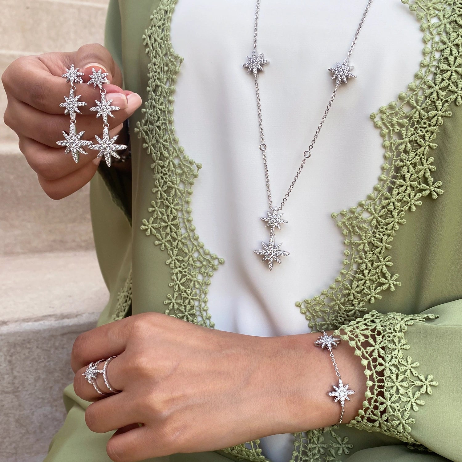 مستوحى من سماء الليل المتلألئة، تجسد هذه المجموعة جمال سكون الليل من خلال كريستالات لامعة تتلألأ كنجوم السماء، مع هلال أنيق يُشكّل بصمة مميزة.