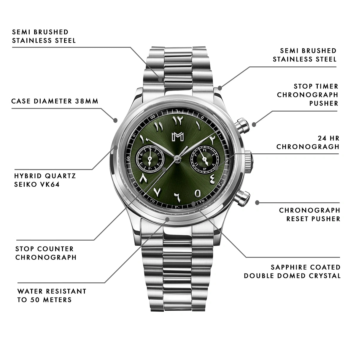 بتصميم يمزج بين روح الماضي ووظائف الحاضر، تُعد هذه الساعة مثالية للعمل، والسفر، والاستخدام اليومي. تضيف الأرقام العربية لمسة ثقافية راقية، فتجعلها قطعة بارزة تنسجم بسلاسة مع إطلالتك.