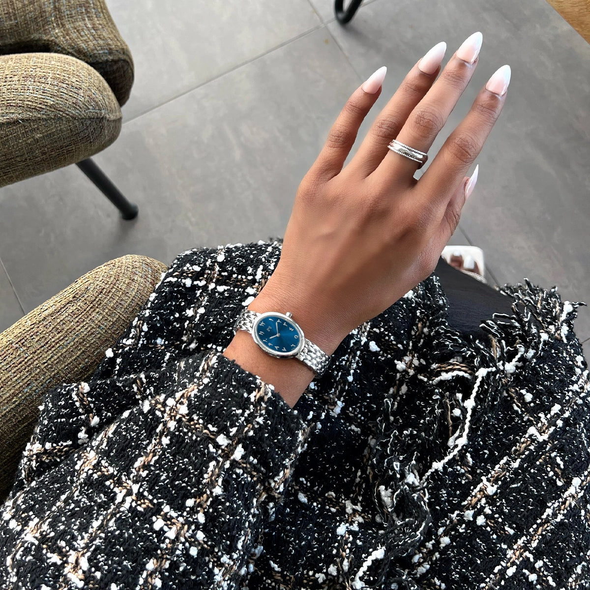 صُممت هذه الساعة لترافقك في إطلالاتك اليومية. بميناء بيضاوي أنيق مع سوار بحلقات مصقولة، لإنسياب سلس مع حركة معصمك ليمنحك خفةً مميزة ولمسة من الرقي البسيط الذي يرافقك طوال اليوم.