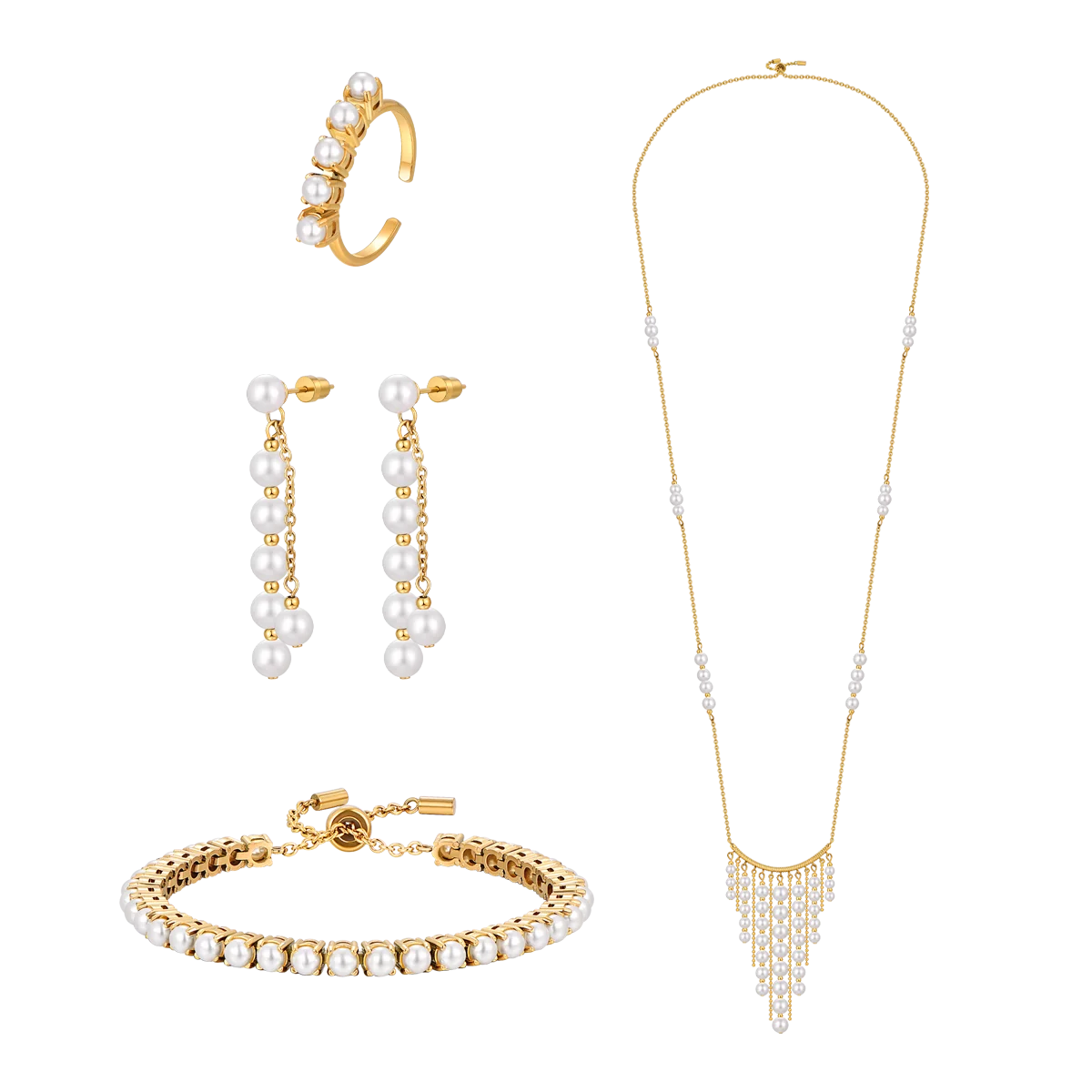 بتفاصيل تنبض بالفخامة، تتميز مجموعة سيمفوني بلآلئ متدلية وسلسلة متلألئة تضيف عمقًا فاخرًا للتصميم. يتحرك السوار والقلادة والأقراط بانسيابية مع كل خطوة، ليمنح إطلالتك ديناميكية راقية تليق بجمعات العيد.