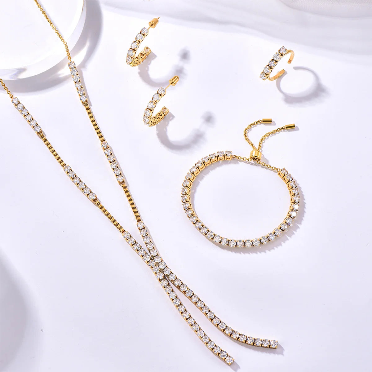 تجسد مجموعة تنس لمسة خالدة من الأناقة ؛ مرصعة بأحجار براقة وقلادة قابلة للتعديل، ليمنحك أناقة وسهولة في التنسيق لجميع مناسباتك.