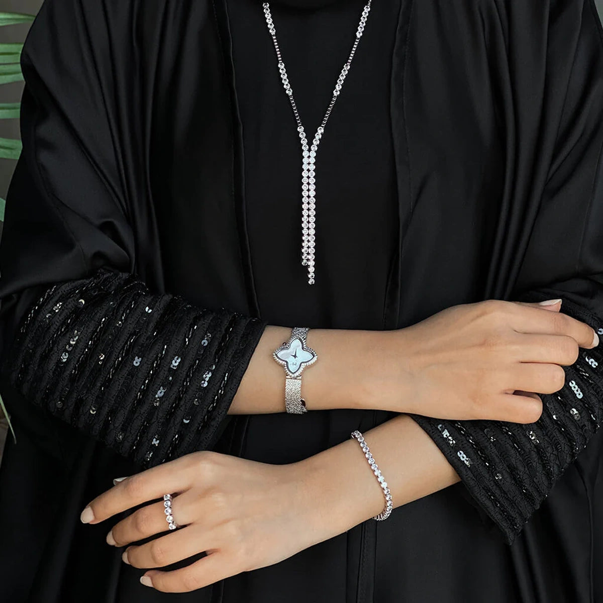 تجسد مجموعة تنس لمسة خالدة من الأناقة ؛ مرصعة بأحجار براقة وقلادة قابلة للتعديل، ليمنحك أناقة وسهولة في التنسيق لجميع مناسباتك.